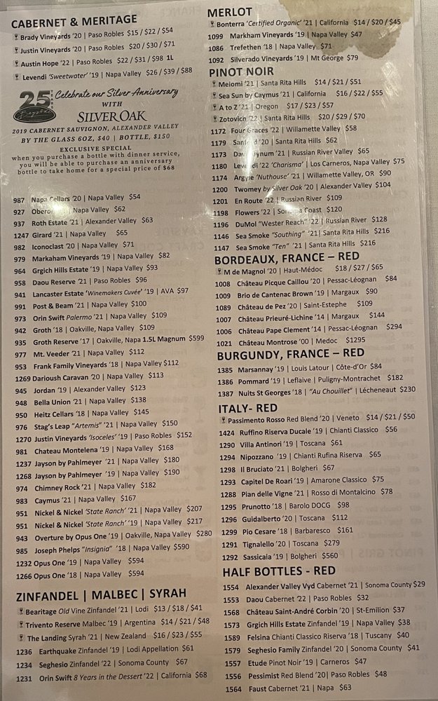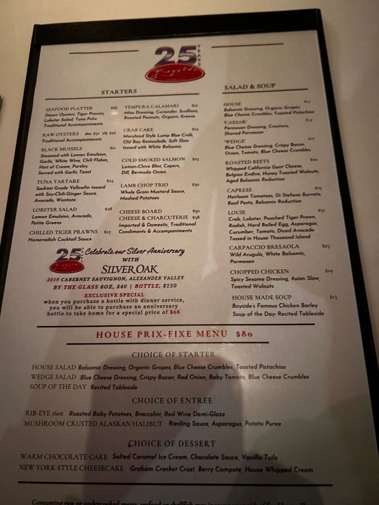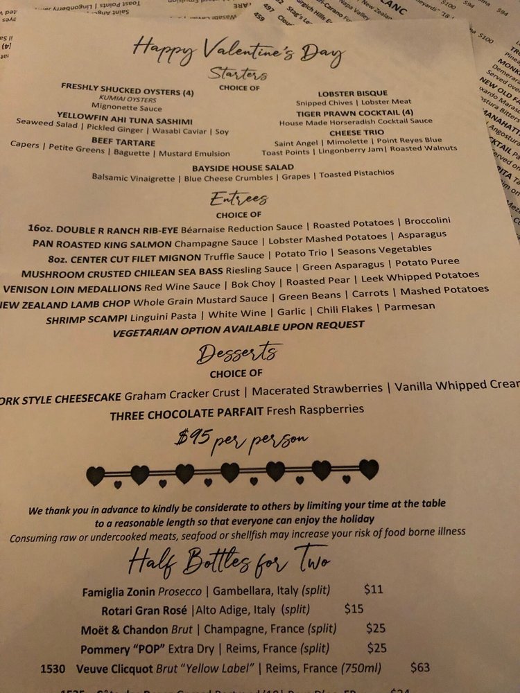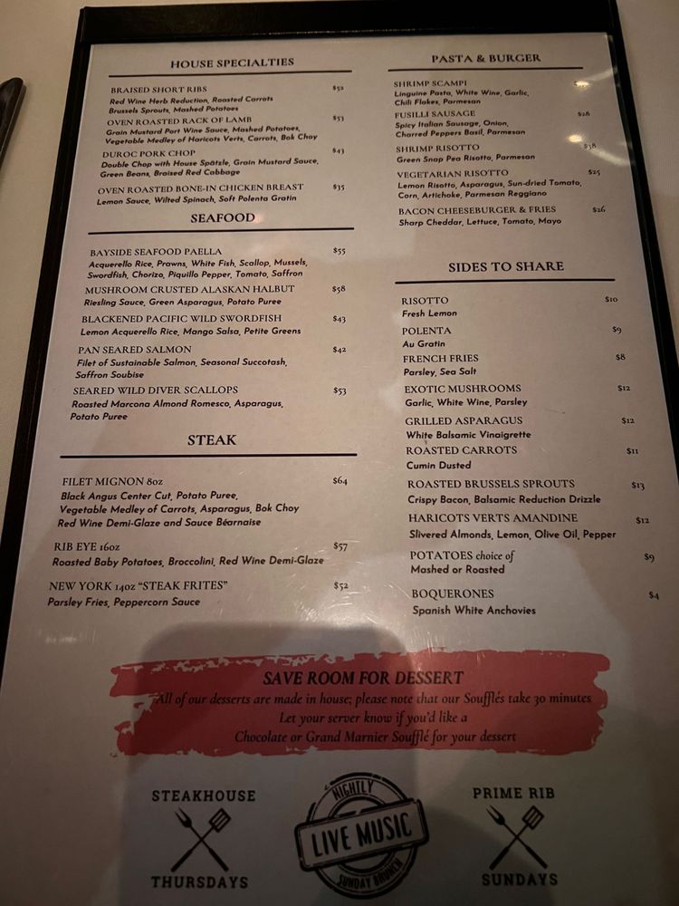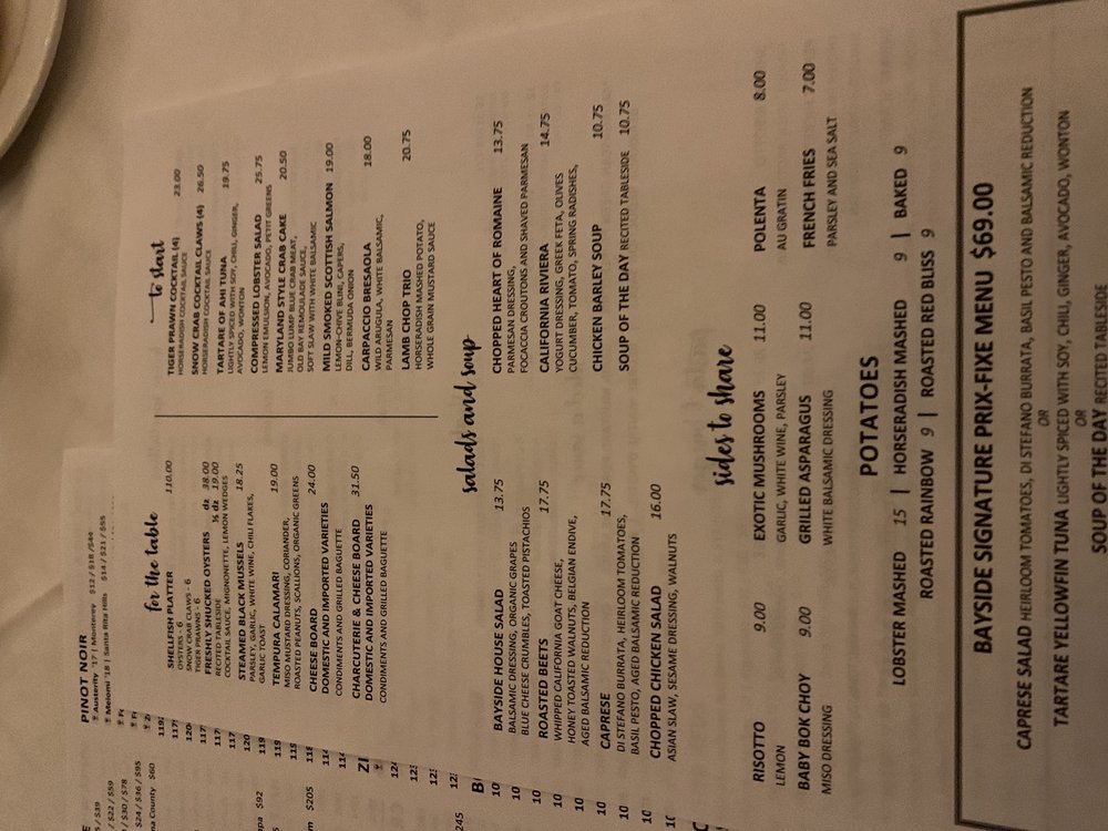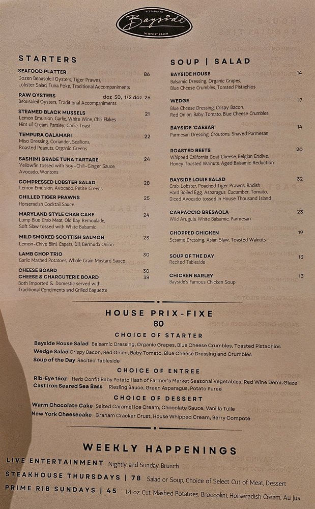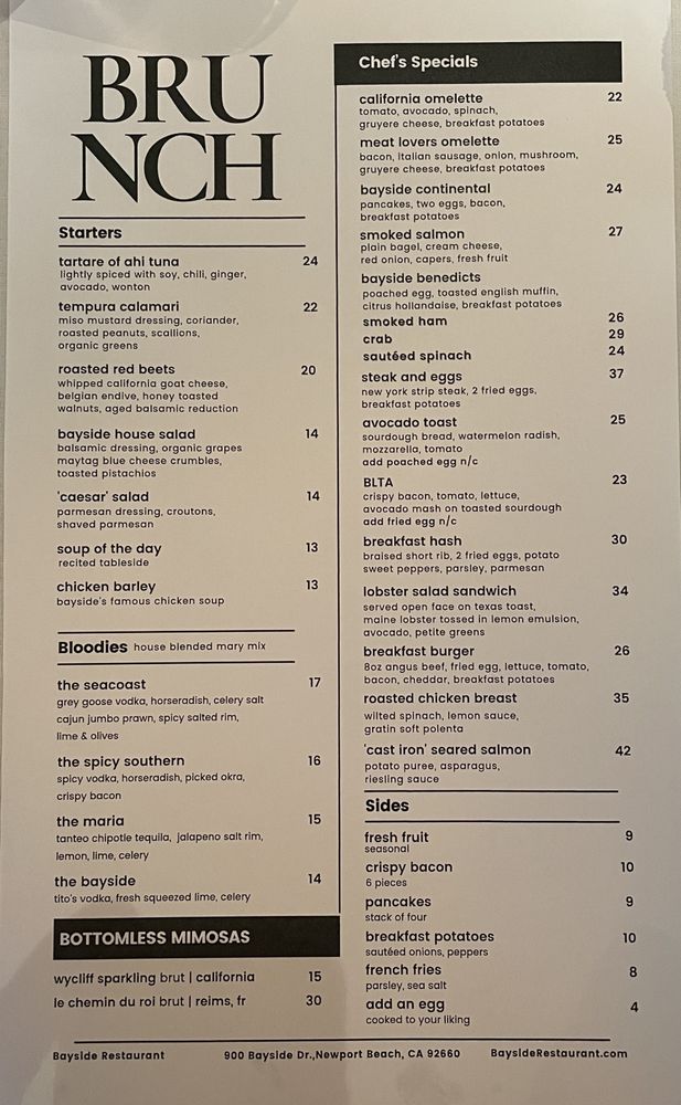 Bayside Restaurant offers a diverse menu of New American cuisine with a focus on seafood, served in a classy yet relaxed setting in Newport Beach, CA. The restaurant provides options for vegan and vegetarian diners and is wheelchair accessible. Customers praise the attentive service and elegant ambiance, making it a popular choice for special occasions or casual dining. Highlights from the menu include the fresh seafood starters like the Tiger Prawn or Snow Crab Cocktail and Tartare of Tuna, as well as the flavorful Large Salads such as the Roasted Red Beets Salad and Shanghai Calamari. The Lobster Salad Sandwich and St. Angel Brie Bruschetta are customer favorites among the sandwiches and burgers selection. Bayside Restaurant also offers live music on select nights, creating a vibrant dining experience.
